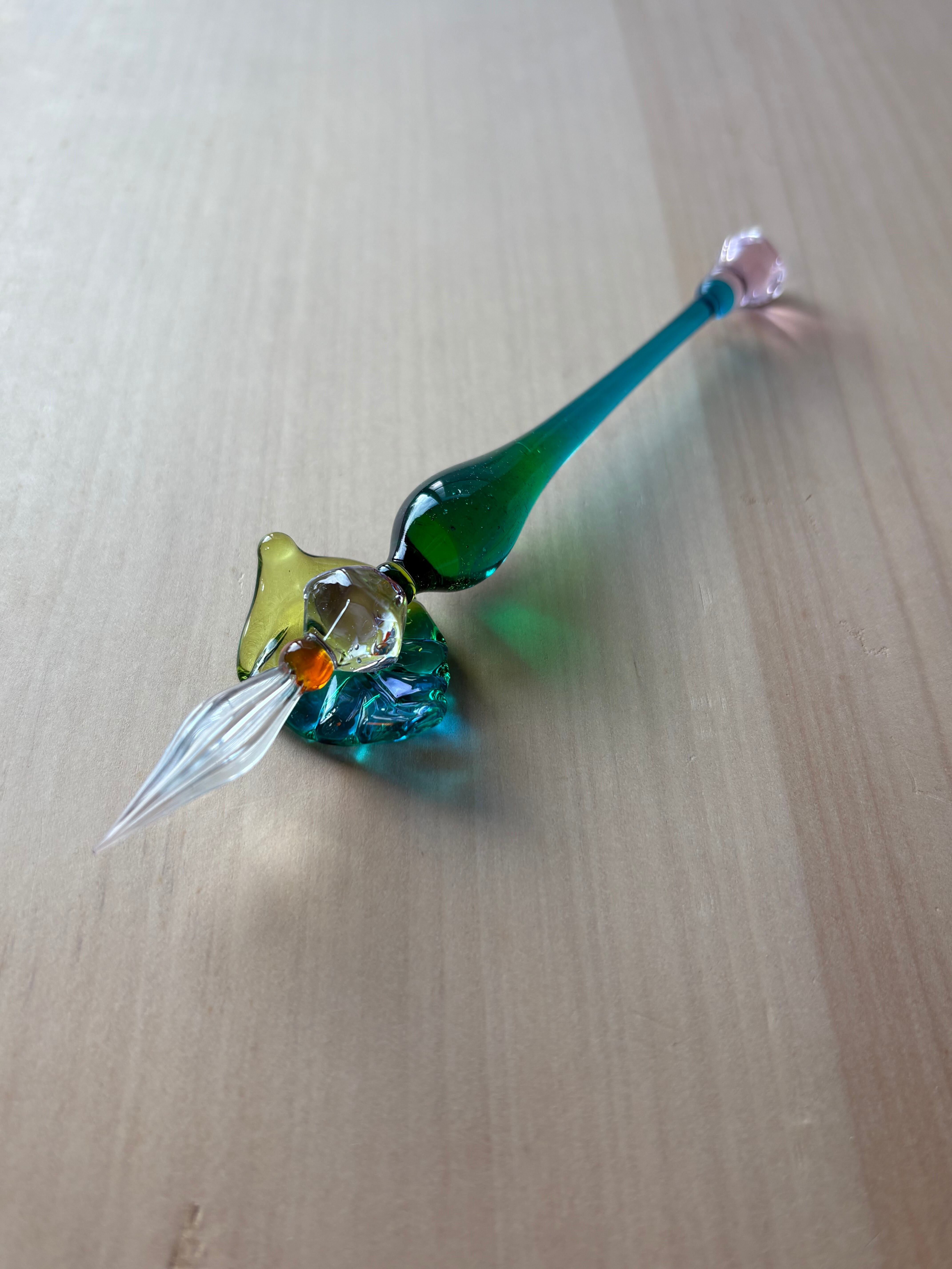 これは、精霊さんが枕にした木の葉をイメージしてお作りした、ガラスのペンレストです。
