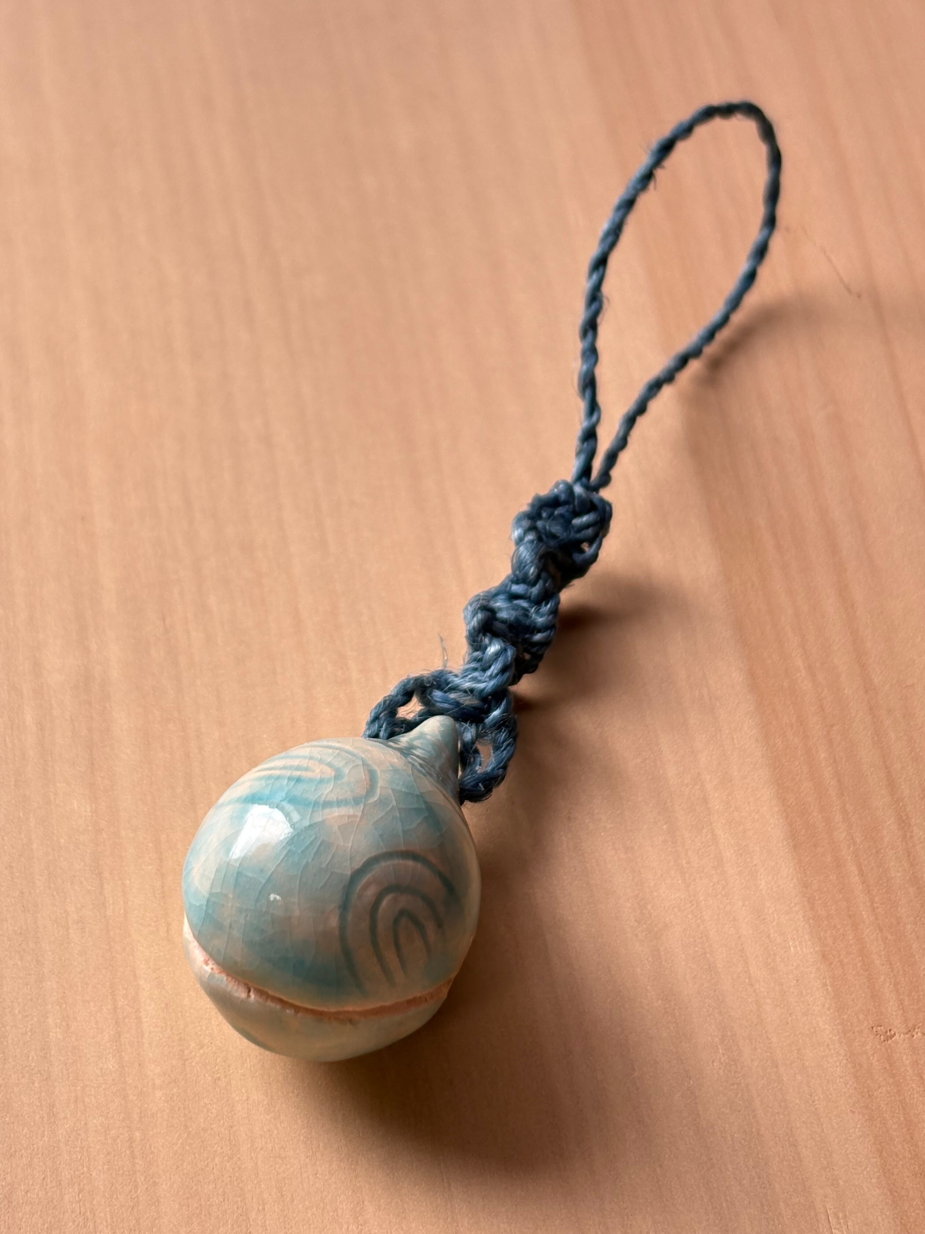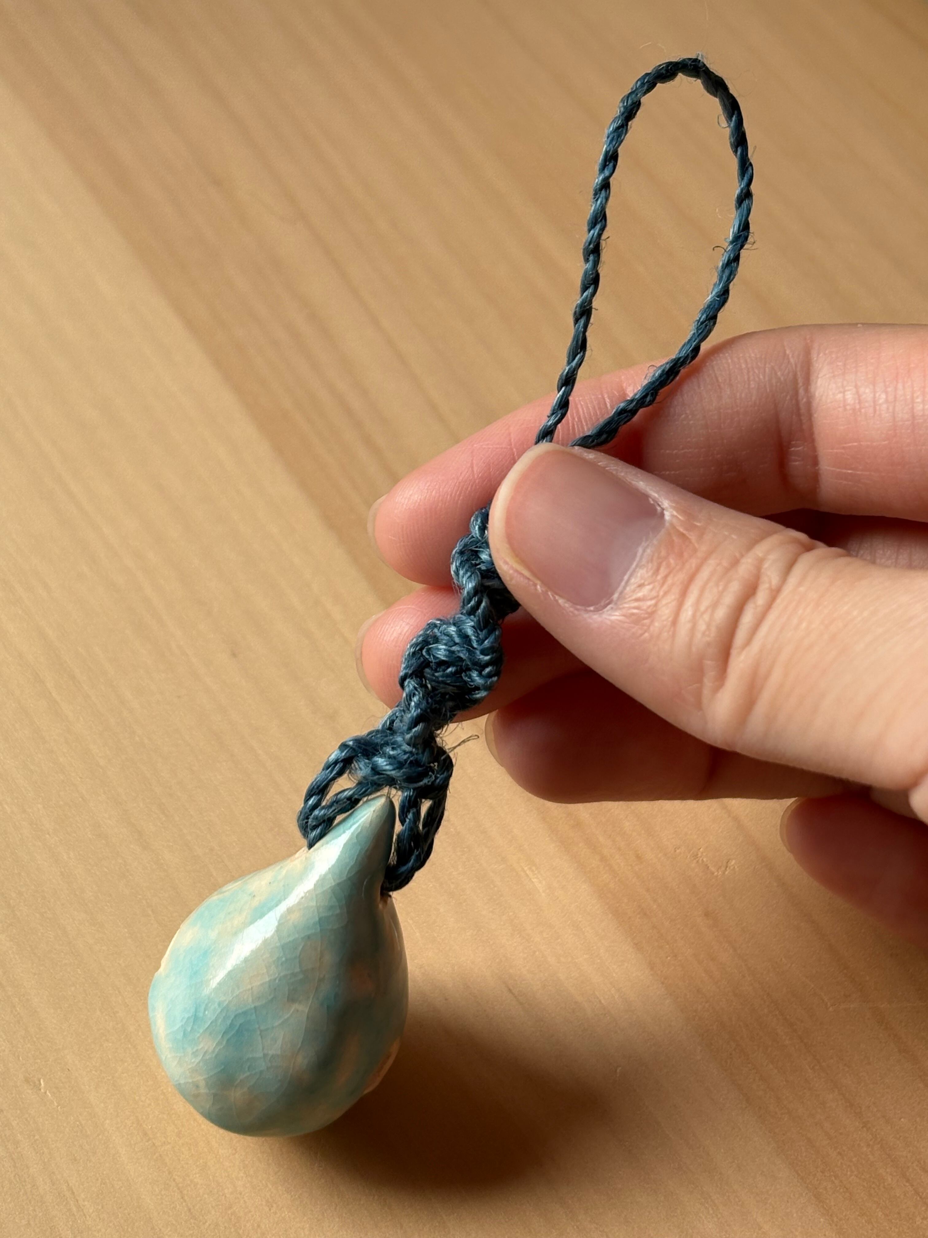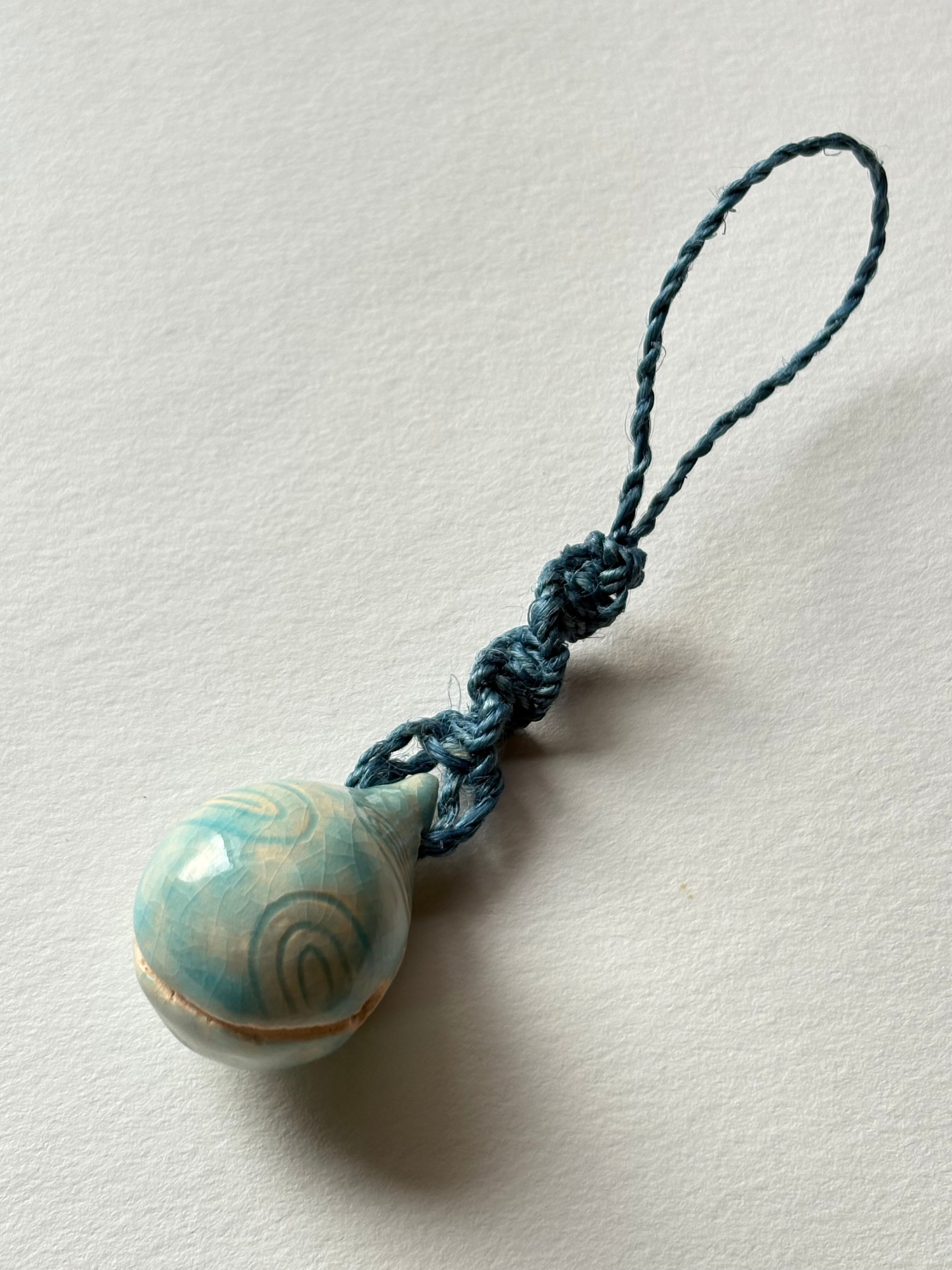 心を込めて、精麻紐を撚り、編んで根付けにしました。