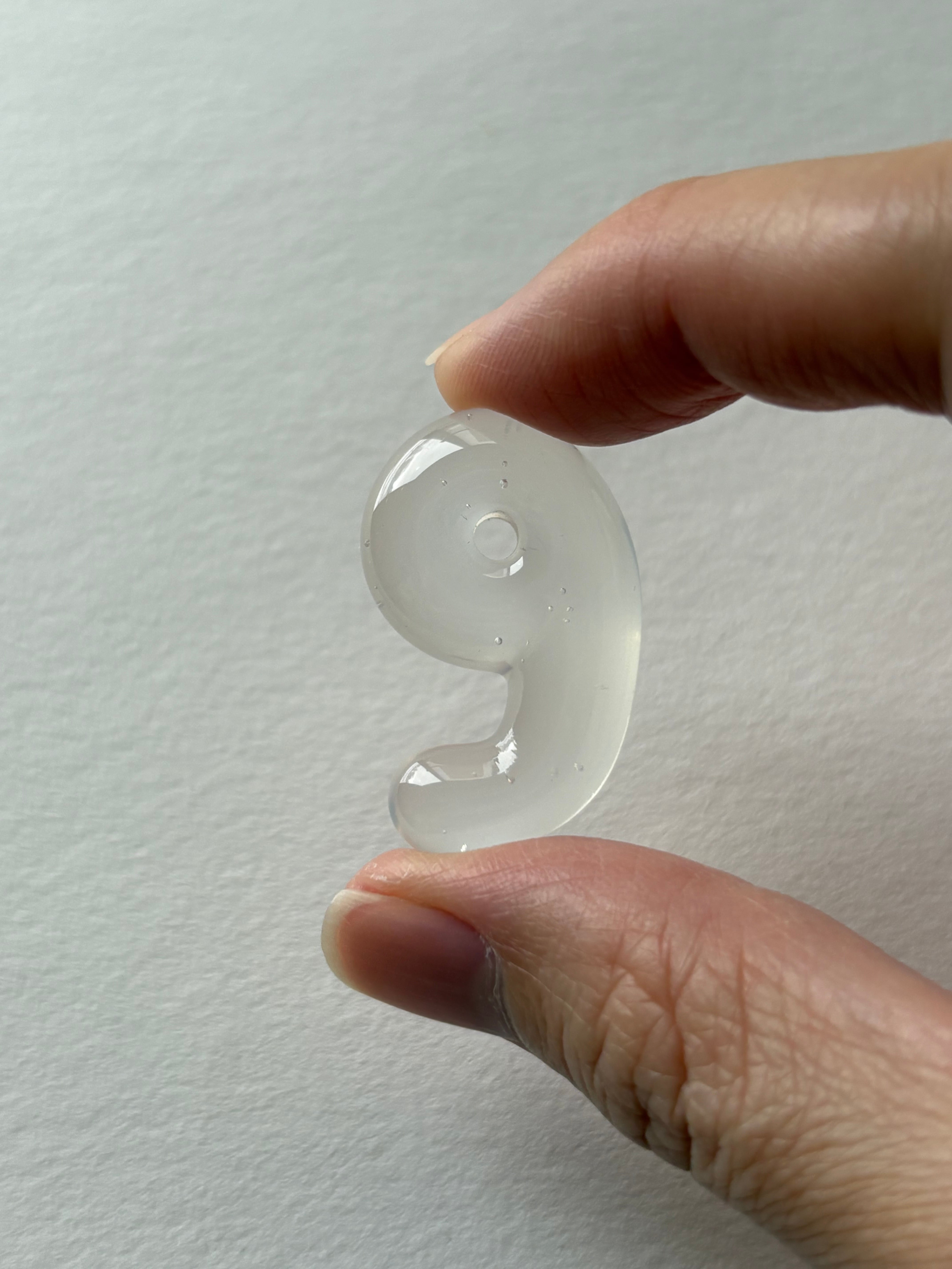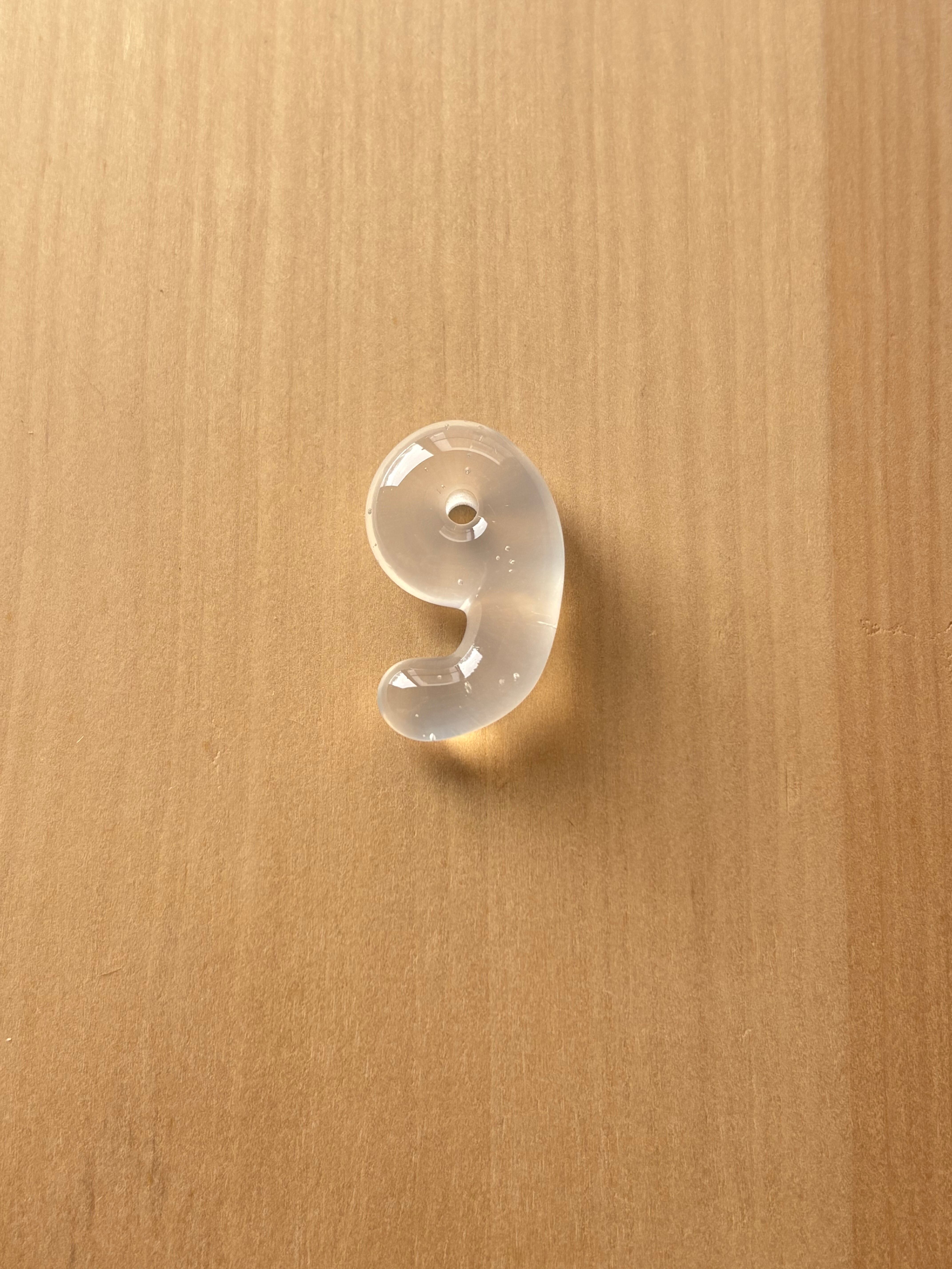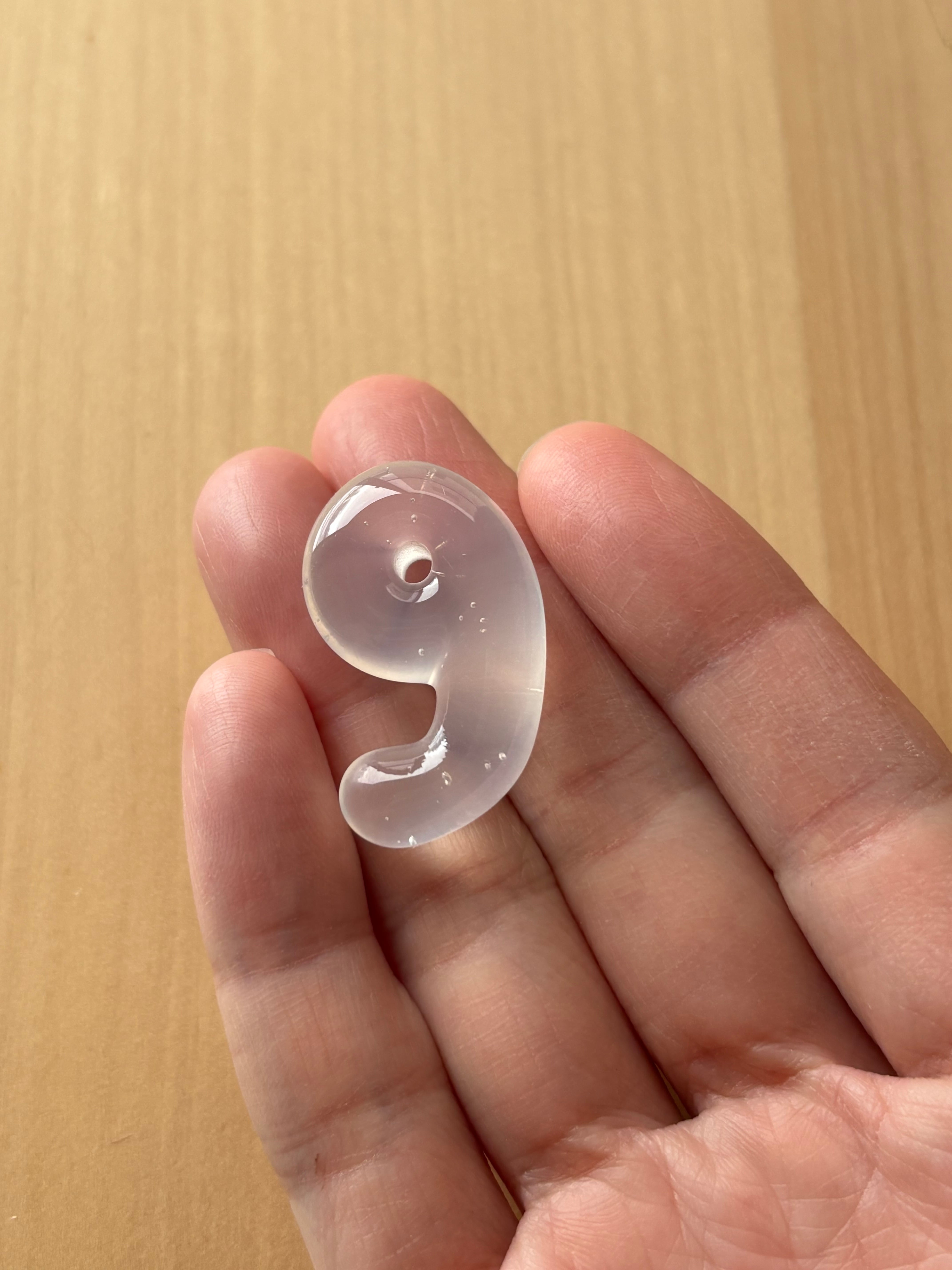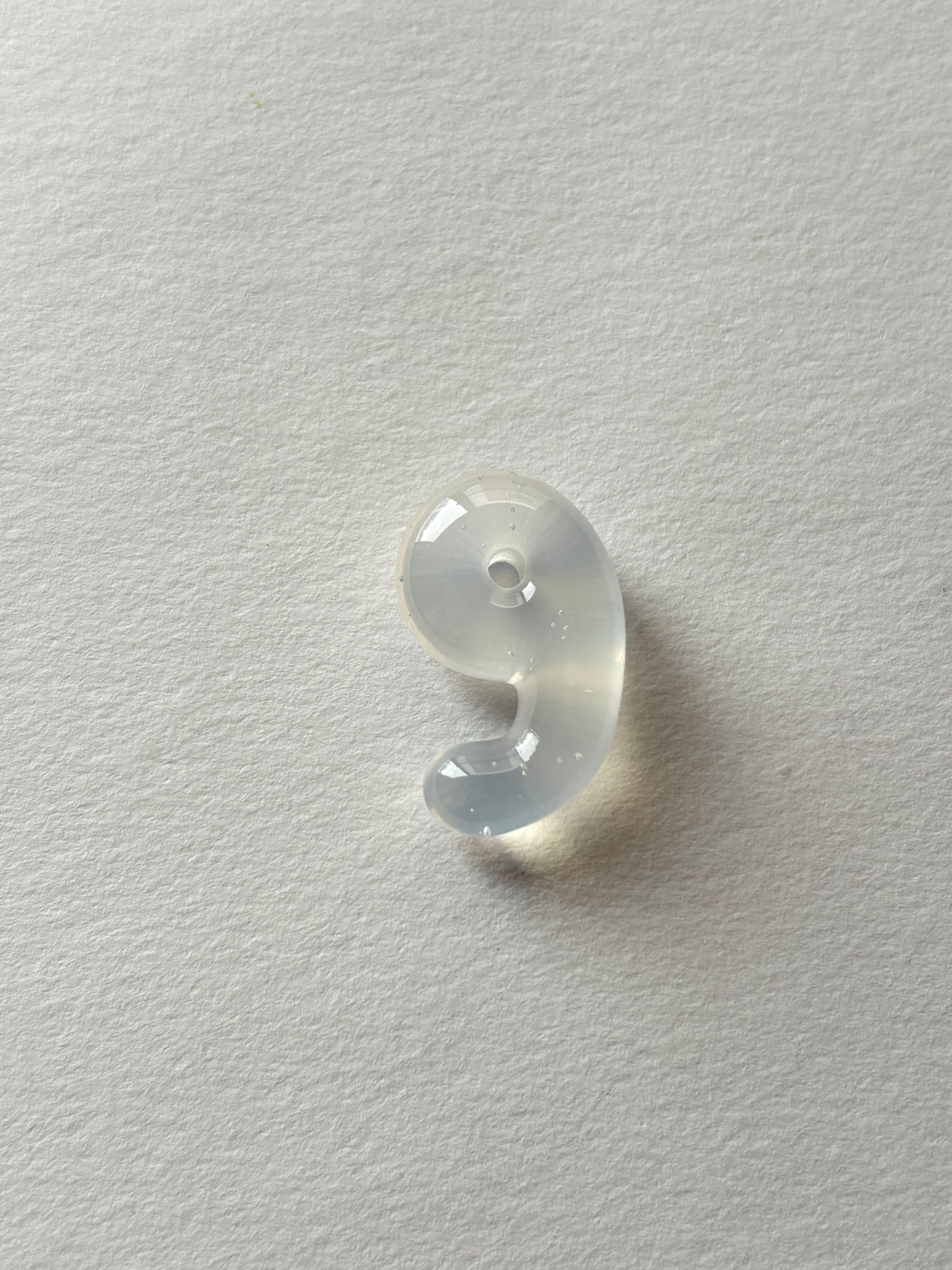 やや濁りのある、雲のような淡い白色の不思議な色の勾玉です。