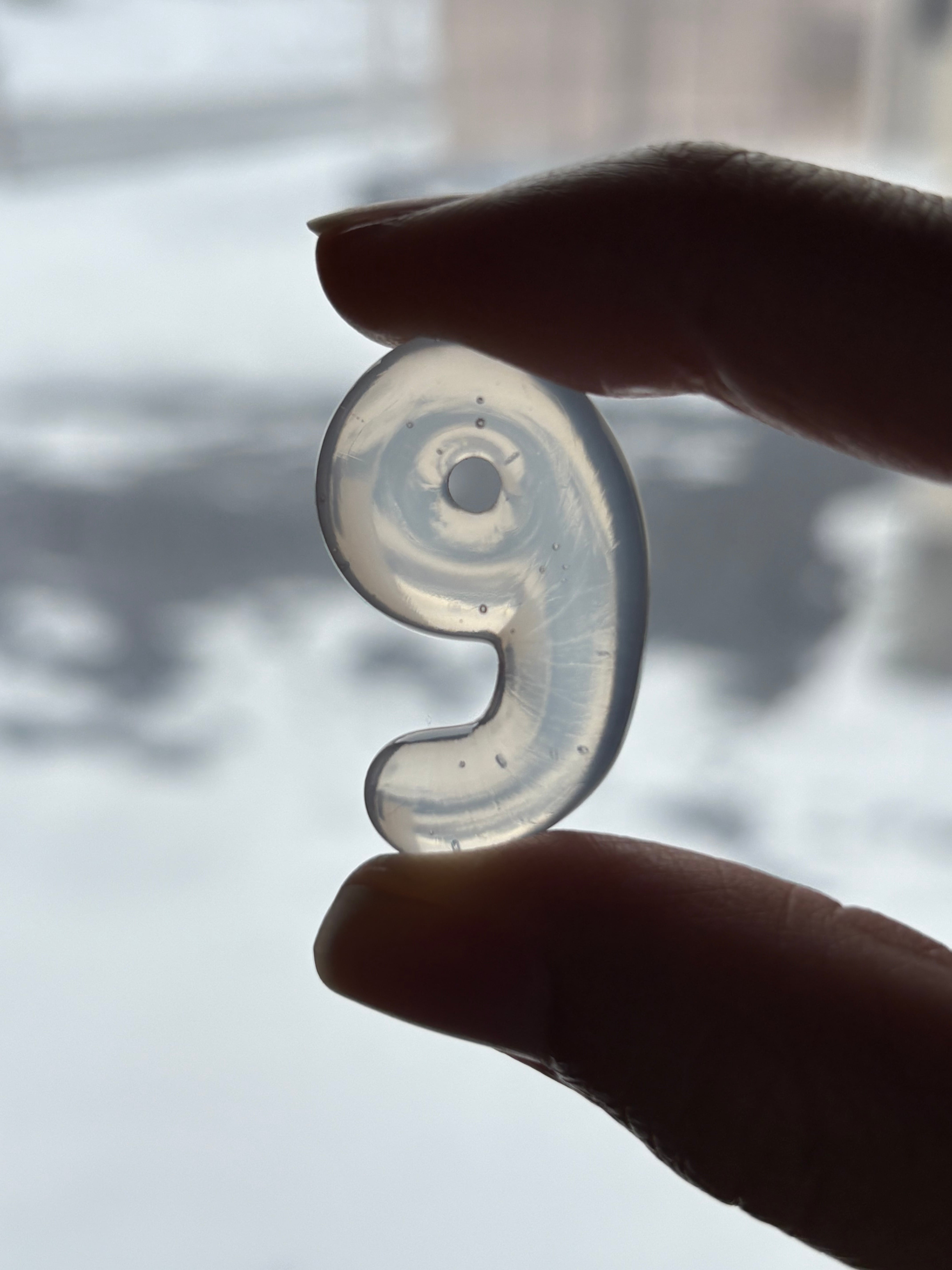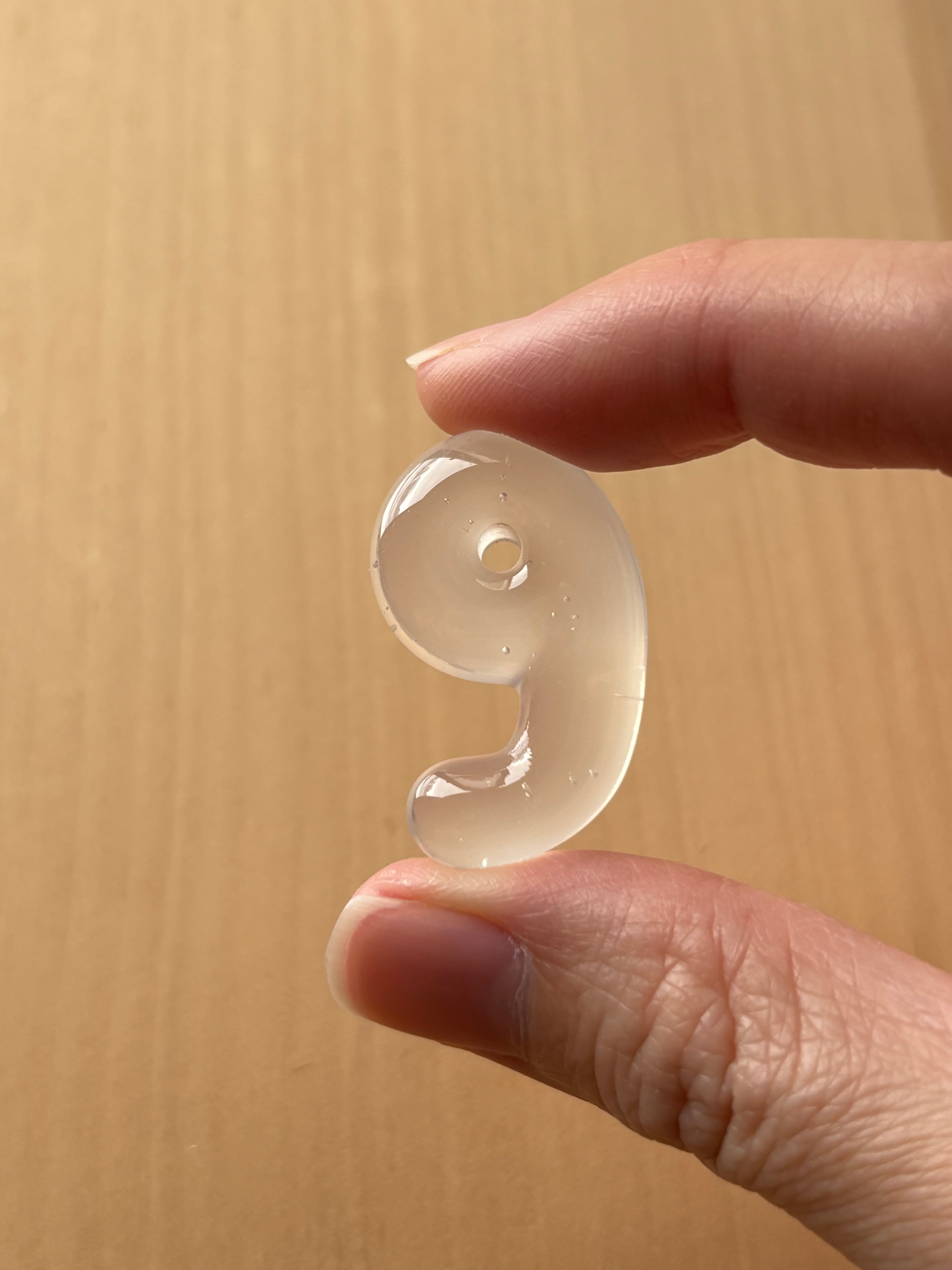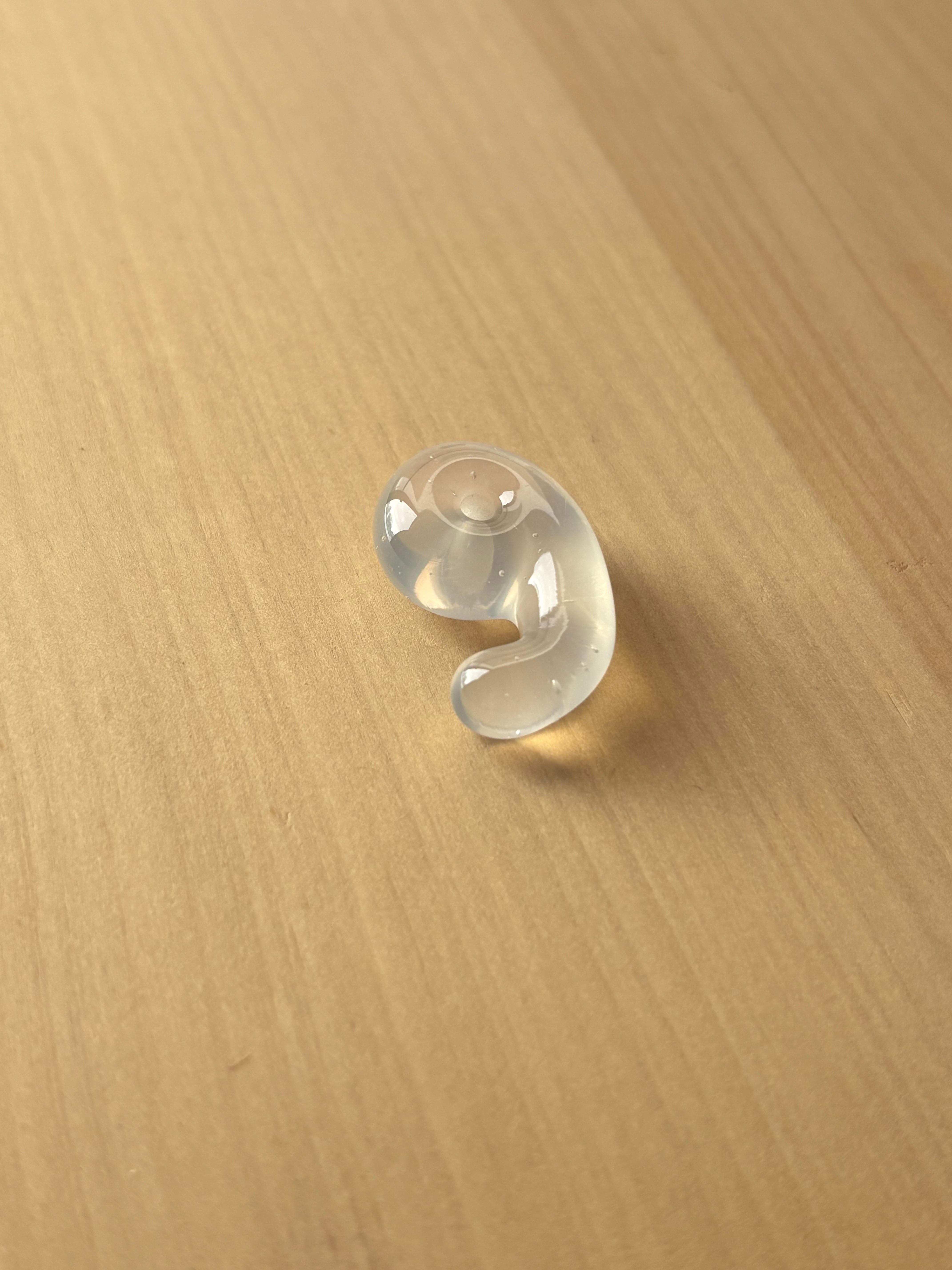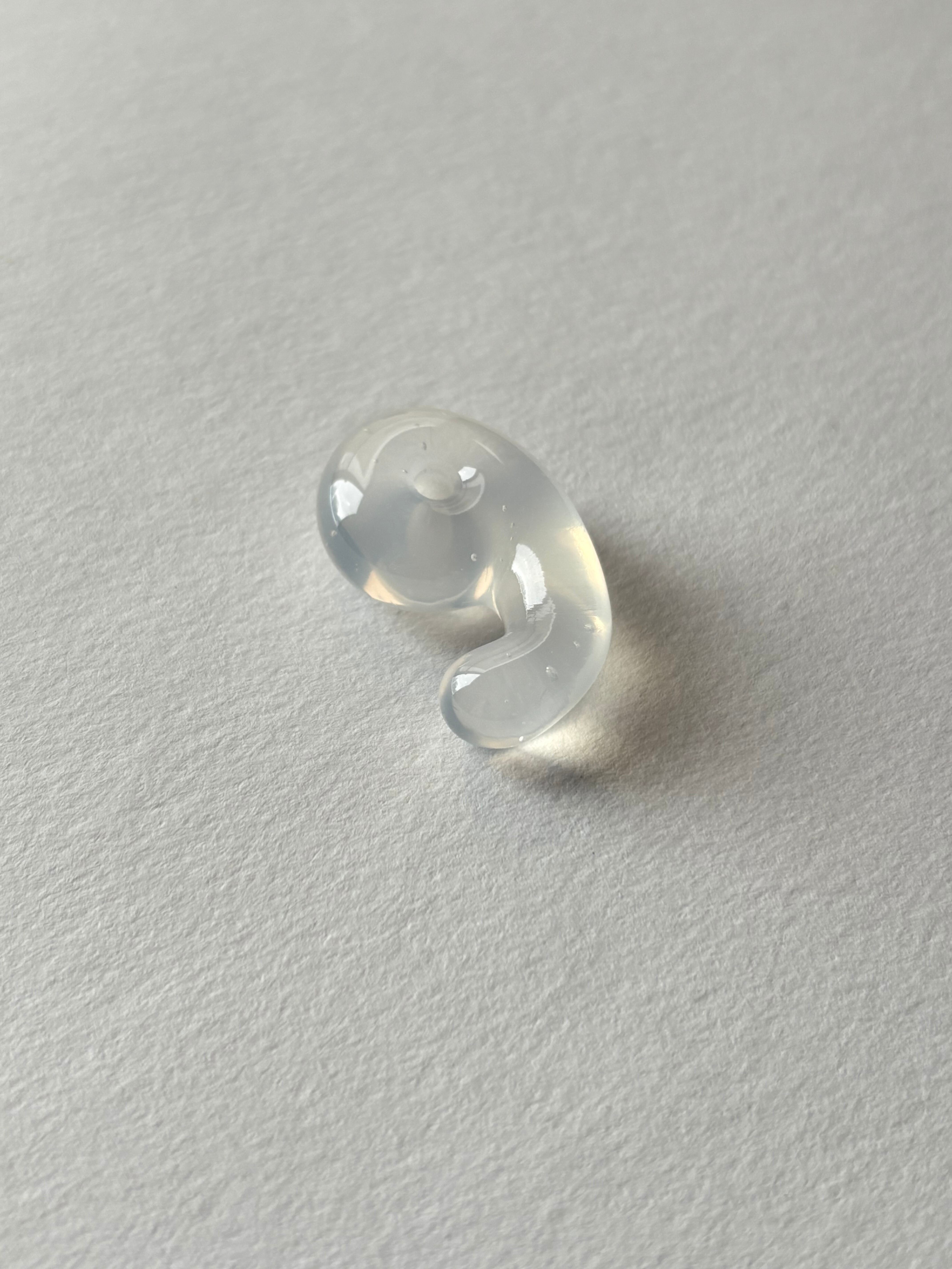 やや濁りのある、雲のような淡い白色の不思議な色の勾玉です。